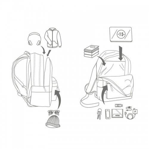 Batoh s pohodlnými polstrovanými popruhy, přední kapsou na zip, polstrovanou kapsou na 15" notebook a doplňky z veganské kůže. Objem 20 l, rozměry 40 x 30 x 15 cm. Materiál 600D polyester, hmotnost 420 g.