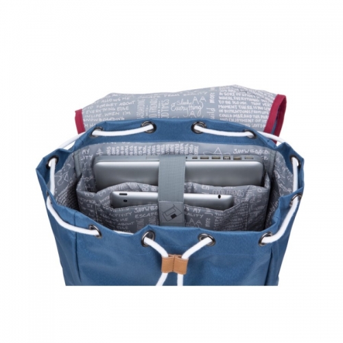 Objem 28L. Vypolstrovaná kapsa na 15" notebook s bočním vstupem, vypolstrovaná kapsa na tablet, hlavní kapsa uzavíratelná na šňůru, přes je "chlopeň" s kapsou, která se zapíná na kovový háček. Další kapsy na a pásky z veganské kůže. Rozměry přibližně 46 x 28 x 16 cm. Materiál 600D polyester, hmotnost 600 g.