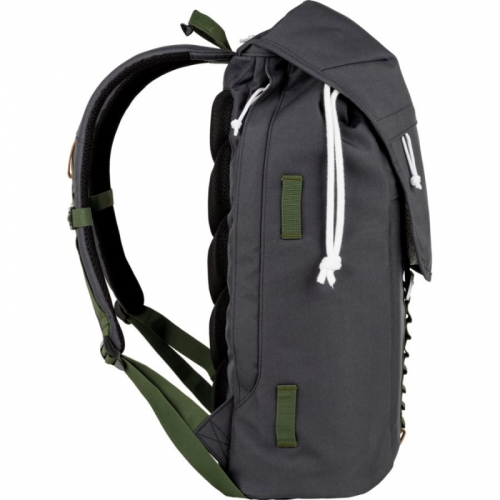 Objem 28L. Vypolstrovaná kapsa na 15" notebook s bočním vstupem, vypolstrovaná kapsa na tablet, hlavní kapsa uzavíratelná na šňůru, přes je "chlopeň" s kapsou, která se zapíná na kovový háček. Další kapsy na a pásky z veganské kůže. Rozměry přibližně 46 x 28 x 16 cm. Materiál 600D polyester, hmotnost 600 g.