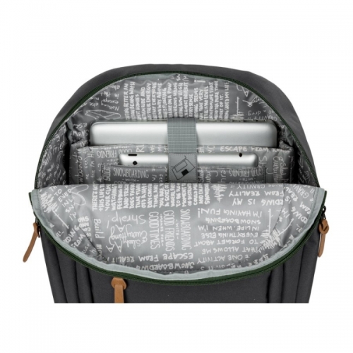 Textilní batoh. Objem 24l. Vypolstrovaná kapsa na 15" notebook, vypolstrovaná kapsa na tablet, prostorná přední kapsa s organizérem, popruhy na upnutí skateboardu, detaily veganské kůže. Rozměry přibližně 44 x 30 x 16 cm. Materiál 600D polyester. Hnotmost 600 g.