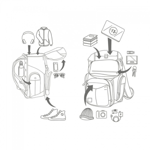 Fleecem vystlaná kapsa na brýle a podobně choulostivé věci, vypolstrovaná kapsa na 15" notebook, vnitřní kapsa na kabely a nabíječky, prostorná přední kapsa s organizérem. Speciální oddělení na boty nebo jiné špinavé či mokré věci s přístupem zespodu. Postranní kapsy, vyztužená záda. Objem 42 l. Rozměry přibližně 55 x 30 x 23 cm. Hmotnost 960 g.