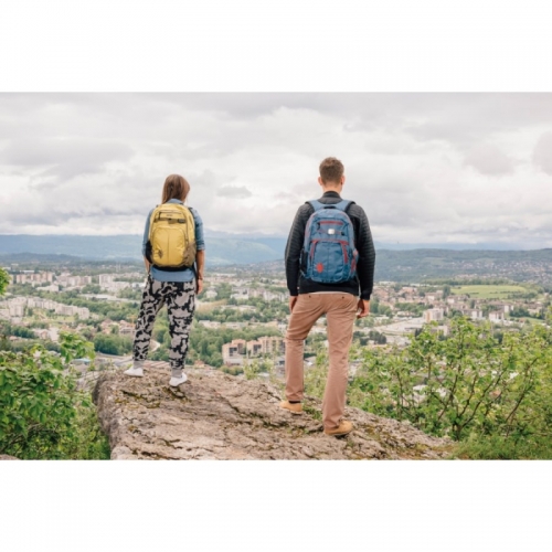 Textilní batoh. Objem 37 l. Fleecem vystlaná kapsa na brýle a podobně choulostivé věci, dvě hlavní prostorná oddělení, kapsa na tablet, vypolstrovaná kapsa na 17" notebook, popruh na nesení skateboardu, postranní kapsa na zip, postranní síťovinová kapsa na lahev.. Rozměry přibližně 52 x 38 x 23 cm. Materiál 600D polyester, hmotnost 980 g.