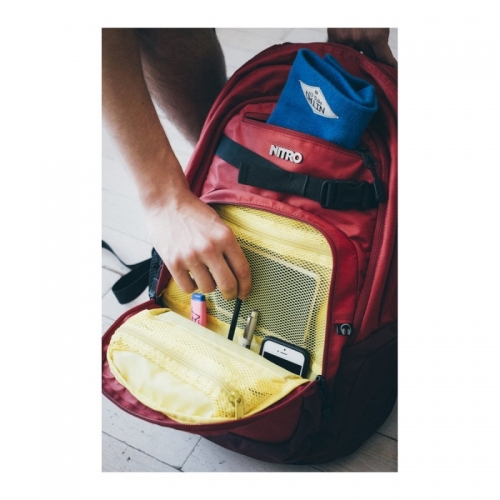 Dvě hlavní prostorná oddělení, prostorný organizér, vnitřní kapsa na suchý zip, vhodná pro nabíječky, kabely tad., popruh na skateboard, boční síťka na lahev, boční polstrovaná kapsa na zip.