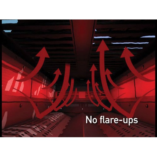Patentovaný systém RBS hořáků ve spojení s rozptylovačem tepla (což je kovový profil, který nahradil keramické brikety) umístěným ve spodní části grilovací vany umožňuje dosažení vydatné a rovnoměrné teploty mezi 250 až 300°C po celé grilovací ploše.