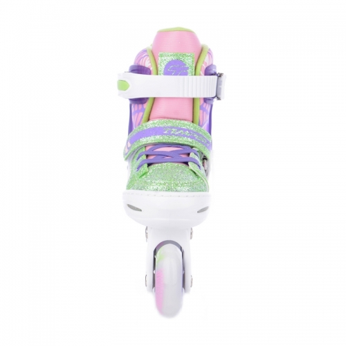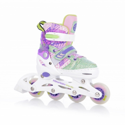 TEMPISH BAM-BU FLASH GIRL jsou nejmenší dětské kolečkové brusle z nabídky TEMPISH, ideální pro první jízdy i pokročilejší dětské bruslaře. Díky chytrému nastavitelnému skeletu začínají už na velikosti EU 26 a mohou růst spolu s dítětem – nastavení zvládnete snadno a rychle pomocí systému EASY PUSH (stisknutí pojistky a posunutí špičky).