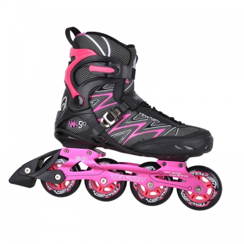 Kolečkové brusle WE-GO LADY jsou určeny pro rekreační, sportovní fitness a kondiční bruslení, snesou střední až vysokou zátěž a jsou určeny jak pro začínající, tak pro pokročilé a zkušené bruslaře. Skelet brusle je středně vysoký, pohyblivá část nad kloubem je zpevněná a tvořená dvěmi oddělenými částmi. Vnitřní liner je speciálně upravený pro dámské chodidlo. Brusle WE-GO jsou osazeny kolečky ze serie RADICAL, které se vyznačují extrémně malým valivým odporem s prodlouženou životností, jsou vhodná na kvalitnější a jemnější povrchy. Šněrování je klasické tkaničkami. Přes nárt je umístěn zpevňující pásek na suchý zip.