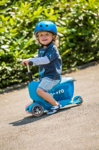 Mini2go Deluxe v modré barvě je inovativní dětské odrážedlo s úložným prostorem a koloběžka v jednom.