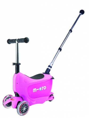 Mini2go Deluxe Plus v růžové barvě je inovativní dětské odrážedlo s úložným prostorem a koloběžka v jednom. Verze PLUS obsahuje řídící tyč pro větší bezpečnost a kontrolu rodiče nad jízdou dítěte.