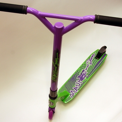 Freestyle koloběžka Maui and Sons Twister v barevné kombinaci Green/purple, má velmi dobrý poměr ceny a výkonu. Je vhodná pro začínající jezdce a děti, kterým umožní nakouknout do světa scooteringu.