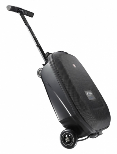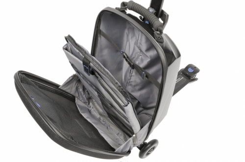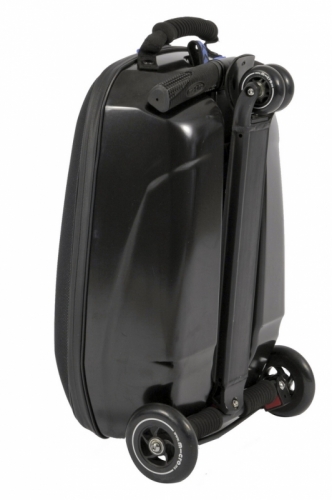 Jednoduchým složením nášlapné desky, se následně z koloběžky stane cestovní kufr na kolečkách s délkově nastavitelným vysouvacím madlem.