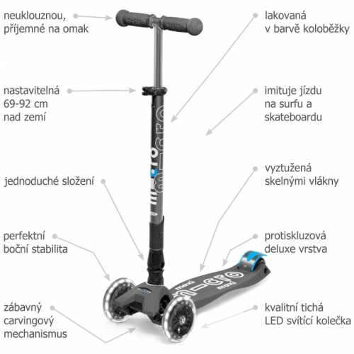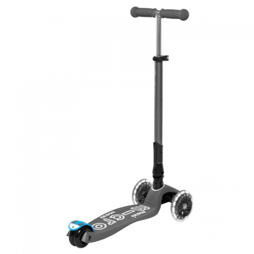 Maxi Micro Deluxe Volcano Grey skládací LED je bezpečná, stabilní a zábavná koloběžka v šedé barvě, určená pro starší děti, juniory a teenagery s doporučenou nosností do 50 kg.
