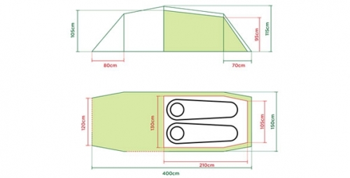 Prostorný tunelový stan. Lomená konstrukce zvětšuje výšku stanu a zároveň zvyšuje odolnost konstrukce proti větru a dešti. Vnitřní zatemnitelná okénka a zdvihnutá podlážka pro ochranu předsíňky před deštěm.