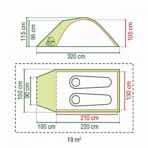 Dvoumístný samonosný turistický stan se dvěma zkříženými pruty, tvořícími ložnici a třetí předsunutá lomená tyč vytváří prostornou předsíňku, dokonale kryjící vchod stanu. To umožňuje dostatečné odvětrávání i při dešti.