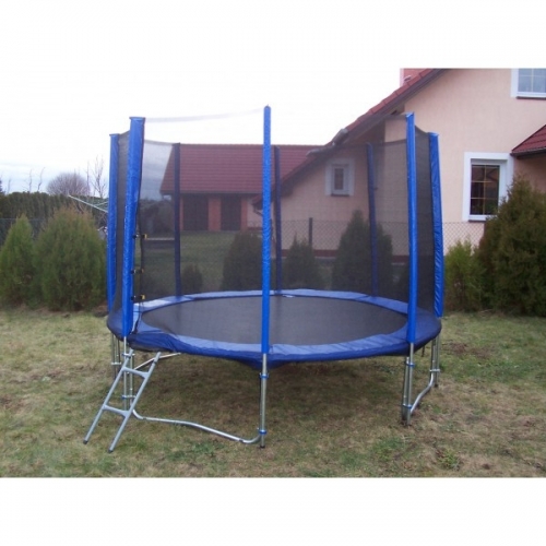 Kvalitní zahradní trampolína s ochrannou sítí o průměru 366 cm, součástí balení je i žebřík a krycí plachta na skákací plochu.