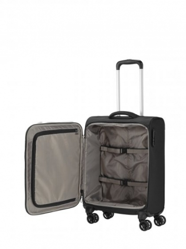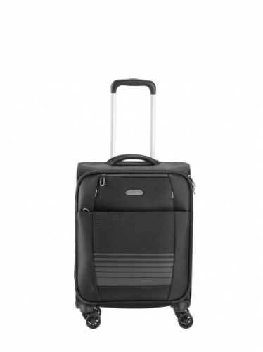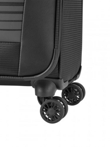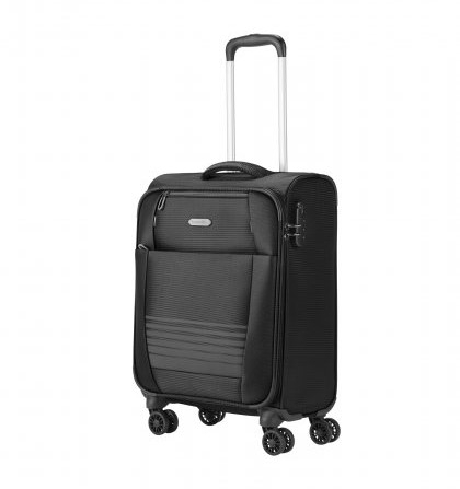 Odlehčený textilní cestovní kufr z odolného polyesteru na čtyřech kolečkách vybavený integrovaným kombinačním zámkem.
