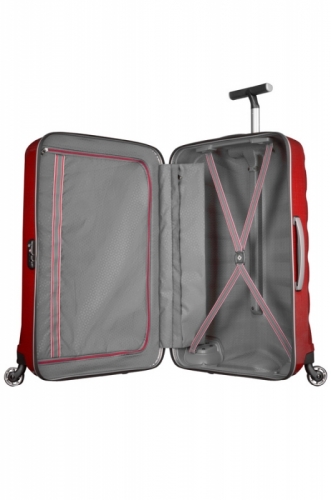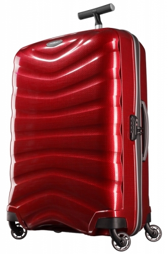 Cestovní kufr /spinner/ z kolekce FIRELITE 75/28 značky Samsonite je vyroben novou revoluční technologií Curv. Jde o velmi lehký a nárazu odolný /recyklovatelný/ materiál. Kufr má čtyři sportovní kolečka pro snadnou manipulaci, vysouvací nastavitelnou rukojeť a dvě ruční madla. Je uzavíratelný voděodolným zipem. Uvnitř je křížový upínací pás pro dobrou fixaci obsahu, kapsa a dělící přepážka na zip. Výhodou - zejména pro cesty do USA je integrovaný tříkombinační zámek TSA.