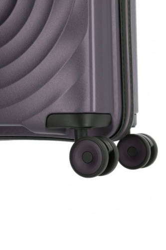 Skořepinový cestovní kufr na čtyřech kolečkách s metalickou texturou a integrovaným TSA zámkem.