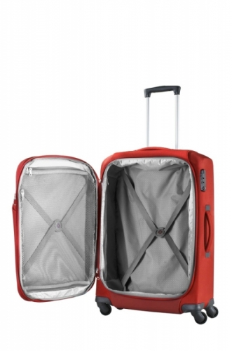 Kufr je vyroben z odolného textilního materiálu polyester s výztuhou z ABS hmoty. Tato hmota, která tvoří boční stěny zajišťuje maximální ochranu, enormní pevnost a odolnost při zachování nízké váhy. Kufr je opatřen integrovaným kódovým zámkem TSA, který je vhodný zejména pro cesty do USA. Dále má vysouvací, nastavitelnou rukojeť, dvě madla, čtyři kolečka pro snadnou manipulaci. Uvnitř je křížové upínání pro fixaci obsahu a síťovaná dělící, odepínací přepážka. Jeho povrch se snadno udržuje. Sympatický je i jeho elegantní vzhled.