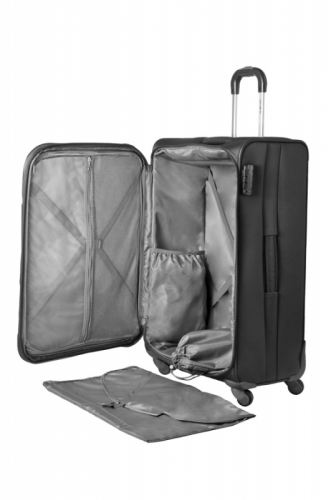 Cestovní kufr je vyroben z odolného polyesteru. Jeho vnitřní část je vybavena křížovým upínáním na obou stranách výborným pro fixaci oděvu a síťovou odepínací přepážkou na zip. Z přední strany je velká samostatná kapsa. Pro větší bezpečnost má zavazadlo integrovaný kódový zámek TSA, který je výhodný zejména pro cesty do USA. Kufr má vysouvací rukojeť, dvě ruční madla a čtyři kolečka pro snadnou manipulaci. Jeho velkou výhodou je možnost rozříření v případě potřeby.