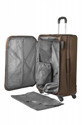 Cestovní kufr je vyroben z odolného polyesteru. Jeho vnitřní část je vybavena křížovým upínáním na obou stranách výborným pro fixaci oděvu a síťovou odepínací přepážkou na zip. Z přední strany je velká samostatná kapsa. Pro větší bezpečnost má zavazadlo integrovaný kódový zámek TSA, který je výhodný zejména pro cesty do USA. Kufr má vysouvací rukojeť, dvě ruční madla a čtyři kolečka pro snadnou manipulaci. Jeho velkou výhodou je možnost rozříření v případě potřeby.