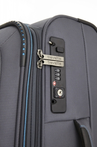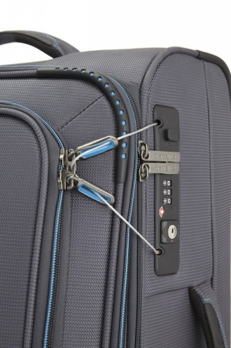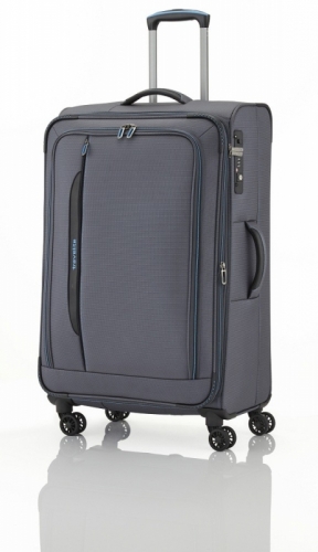 Špičkově zpracovaný textilní kufr na čtyřech kolečkách s expandérem.