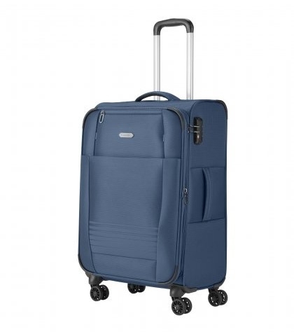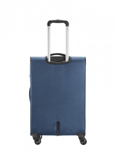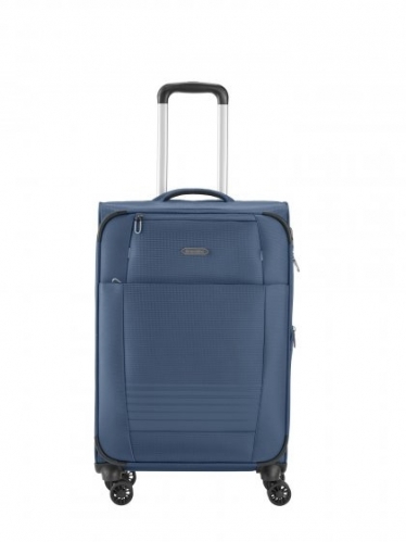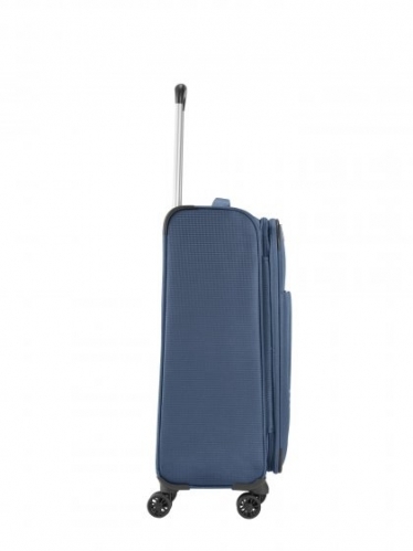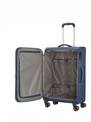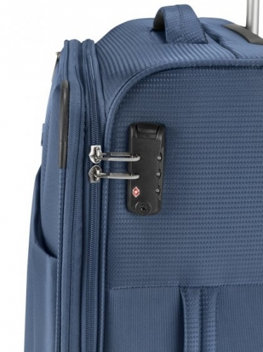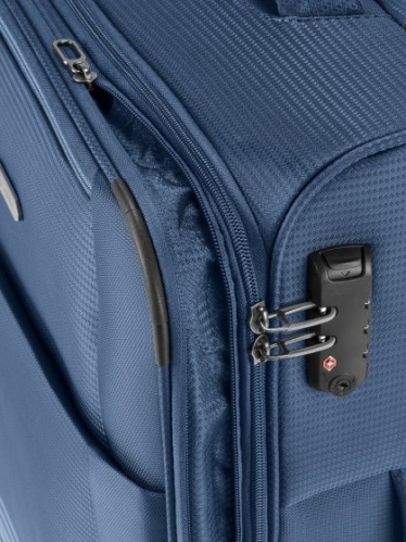 Odlehčený textilní cestovní kufr z odolného polyesteru na čtyřech kolečkách vybavený integrovaným TSA zámkem a expandérem.