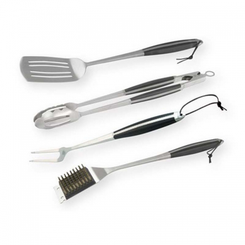 Sada nerezového grilovací nářadí obsahující kleště, vidličku, obracečku a kartáč. Rukojeť je opatřena příjemným materiálem odolným vysokým teplotám a poutkem pro zavěšení.