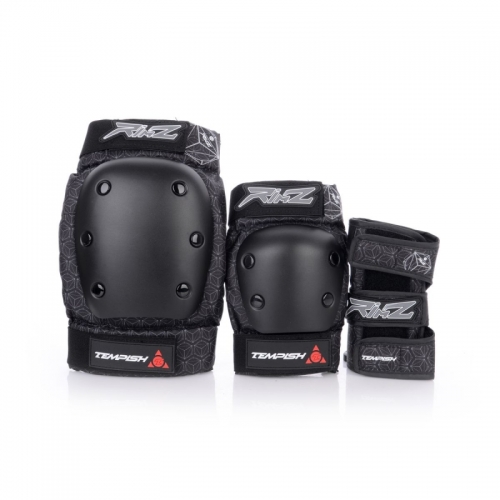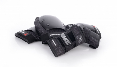 Klasická 3 sada chráničů (kolena, lokty, zápěstí) pro agresivní bruslení, skateboardy, longboardy, downhill, freestylové koloběžky. Chránič zápěstí je tradiční konstrukce s plastovými výztuhami na zápěstí z obou stran. Stabilní poloha je zajištěna trojící pásku s přichycením na suchý zip. Vnitřní materiál je velmi jemný a dobře saje vlhkost (pot). Plastové výztuhy je možno opatrně vyjmout a chránič vyprat ve vlažné vodě se saponátem. Chrániče kolen a loktů: Vnější pevný chránič z houževnatého plastického materiálu dobře chrání klouby při nárazech. K textilní části jsou připevněny za pomocí 3 párů velkých nýtů. Vnitřní silná pěnovka intenzivně a spolehlivě tlumí nárazy a omezuje zranění. Vnitřní vybrání v pěnové bandáži zabraňuje samovolnému posunu chrániče, zajišťuje jeho správnou polohu a tím tu největší ochranu. Textilní část chrániče se skládá ze dvou částí: první část je připevněna pomocí elastického pásku ke končetině nad kloubem a pohybuje se společně s ní, druhá část chrániče je umístěna přímo na kloubu a chrání jej v případě nárazu. Touto konstrukcí je zajištěna velká volnost pohybu a chránič minimálně omezuje pohyb. Uživatel po krátké chvíli přestane vnímat, že nějaký chránič má, neboť se přirozeně přizpůsobuje tak, jak se bruslař pohybuje. Spodní pásek se zajišťuje zpětným protažením v oku na boku chrániči opět na pásku za pomocí suchého zipu. Suchý zip je na vnitřní straně a tudíž je minimální možnost, že došlo k jeho uvolnění při pádu, nebo kolizi. Chrániče jsou vybaveny punčoškou, která chránič podrží ve správné poloze kdyby náhodou došlo při pádu k uvolnění pásku a také tlumí tlak pásku na kůži.
