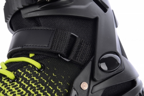 Botu uzavřete pomocí klasických tkaniček a chodidlo pevně zafixujete ve skeletu nártovým páskem na suchý zip. Horní část skeletu uzavřete za pomocí stahovacího pásku s mikropřezkou.