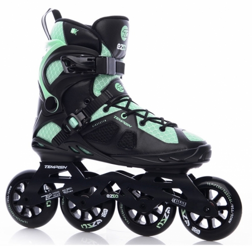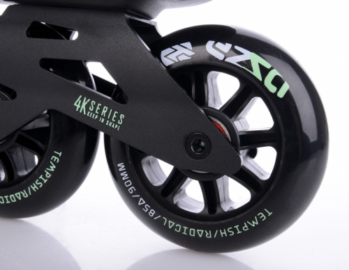 U bruslí je použita TEMPISH brzda univerzální „S“. Brzda je přiložena v krabici společně se 4-mi šroubky – velmi jednoduchá montáž – bez nutnosti demontovat osky a kolečka. Materiál držáku brzdy – nylon se skelným vláknem – velmi tuhý a pevný, který umožňuje nastavit výšku špalku. Materiál špalku TPR. Brusle EZZA 90 jsou osazeny kolečky ze serie RADICAL, PU casting (PUC), Super Hi-Rebound (SHR). Jedná se o vysoce kvalitní kolečka s velmi nízkým valivým odporem a dlouhou životností, které dosahují velmi nízkého opotřebení na různých površích a výborně tlumí nerovnosti povrchu což zaručuje opravdu komfortní jízdu. Kolečka jsou osazena ložisky ABEC 9 hi-precision s gumovou prachovkou. Šněrování je klasické tkaničkami. Přes nárt je umístěn zpevňující pásek s mikropřezkou.