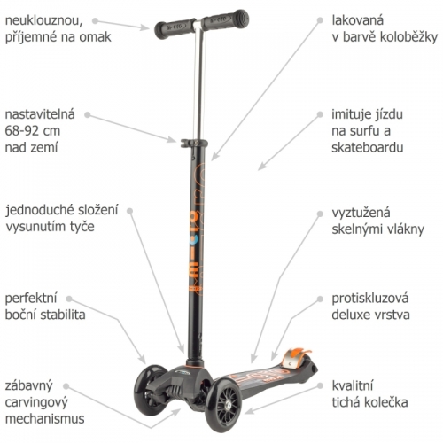 Maxi Micro Deluxe Black je bezpečná, stabilní a zábavná koloběžka v černé barvě, určená pro starší děti, juniory a teenagery s doporučenou nosností do 50 kg.