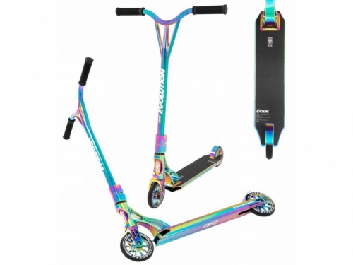 Freestyle koloběžka vhodná pro náročné jezdce s odolnou konstrukcí z velice pevného, ale lehkého hliníku HS7000. Freestyle koloběžka Code má větší kola 120mm, které dovolují vyšší rychlost a vysoce kvalitní ložiska ABEC 9 Carbon.