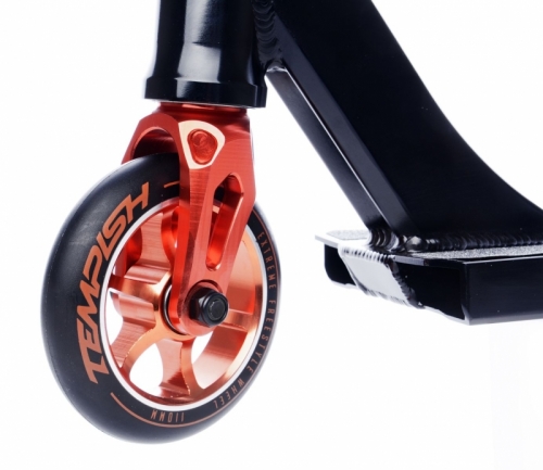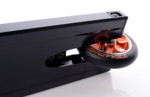 Kolečka o průměru 110 mm, tvrdost 88A Super Hi-rebound s hliníkovým jádrem, vysoce kvalitní ložiska ABEC 9 chrome top speed, hi-precision s gumovými prachovkami.