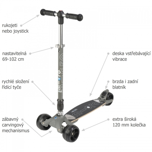 Nový konstrukčně vylepšený a designově odladěný nástupce Kickboardu Micro Monster je nyní nově s řídítky typu T-Bar a joystick v jednom balení. Řídítka jsou snadno měnitelná, takže pokud máte náladu nasadíte joystick a rázem máte adrenalinový zážitek z jízdy. Pokud budete chtít klidnou, stabilní jízdu, nasadíte řídítka typu T-bar.