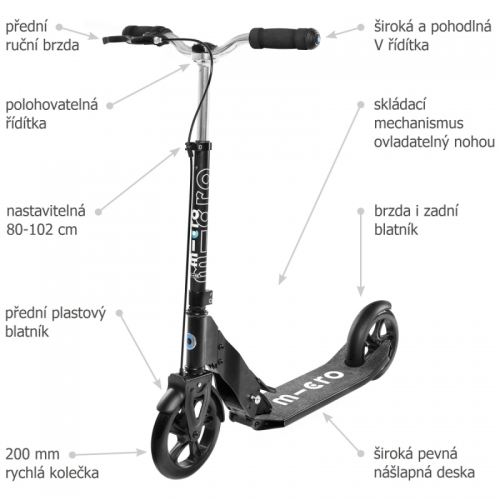 Micro Downtown Black je pohodlná a velice komfortní skládací koloběžka pro každodenní městské dojíždění.