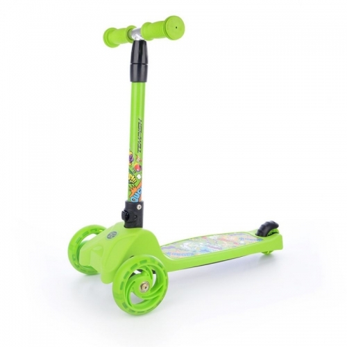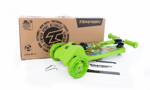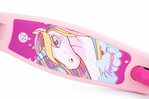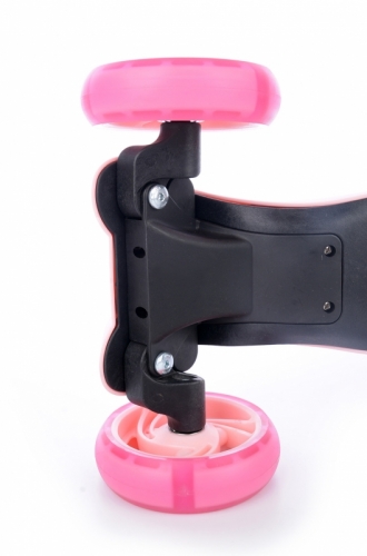 Bezpečná koloběžka pro děti od 3 let. Velmi jednoduchý skládací systém na 1 tlačítko. Nastavitelná výška řídítek ve 4 polohách: 56 cm, 61 cm, 66 cm, 71cm. Koloběžka je velmi stabilní kvůli použití 3 koleček. Velmi jednoduchá na ovládání – přenášení váhy na stranu, čímž koloběžka zatáčí. Deska má užitnou plochu 29 x 12 cm. Přední i zadní kolečka jsou osvětlena LED multicolor světly.