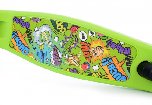 Bezpečná koloběžka pro děti od 3 let. Velmi jednoduchý skládací systém na 1 tlačítko. Nastavitelná výška řídítek ve 4 polohách: 56 cm, 61 cm, 66 cm, 71cm. Koloběžka je velmi stabilní kvůli použití 3 koleček. Velmi jednoduchá na ovládání – přenášení váhy na stranu, čímž koloběžka zatáčí. Deska má užitnou plochu 29 x 12 cm. Přední i zadní kolečka jsou osvětlena LED multicolor světly.
