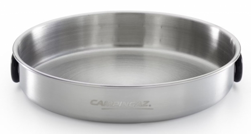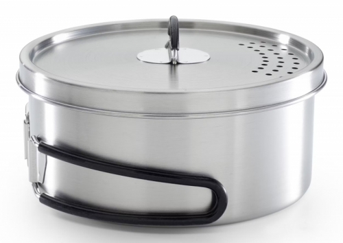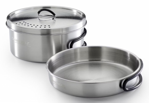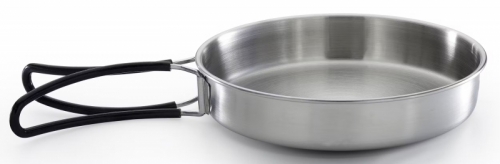 Trekingové nádobí z nerezové oceli (AISI 304) a silikonovým madlem. Balení obsahuje jeden hrnec s pokličkou a pánev.