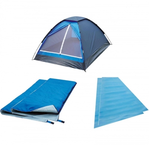 Praktický kempinkový set je vhodný zejména na festivaly a krátké pobyty v letním počasí. Výhodná sada obsahující stan pro dvě osoby, dva spací pytle a karimatky. Stan má tvar klasického iglú a sklolaminátovou konstrukci o dvou prutech, takže ho postavíte snadno a rychle. Má jeden plášť s vodním sloupcem 800 mm a podlážku se sloupcem 3000 mm. Švy jsou přelepené.