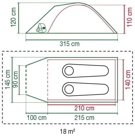 Samonosný turistický stan se dvěma zkříženými pruty, tvořícími ložnici a třetí předsunutá tyč vytváří prostornou předsíňku s integrovanou podlážkou.Zatemnitelná průhledná okna v předsíňce dodávají dostatek světla uvnitř.