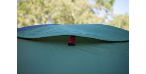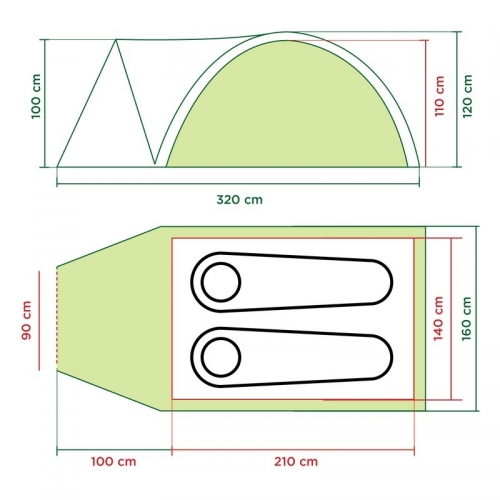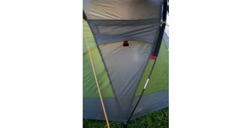 Samonosný turistický stan se dvěma zkříženými pruty, tvořícími ložnici a třetí předsunutá tyč vytváří prostornou předsíňku s integrovanou podlážkou.