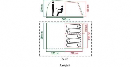 Nejpraktičtější konstrukce rodinného stanu Raleigh 5 sestávající z vysoké kupolovité haly a k ní připojené tunelové ložnice. Vyvýšená integrovaná podlážka umožní halu dokonale uzavřít před nepohodou venku, velké okno zajišťuje dostatek světla.
