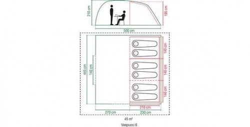 Rodinný palác Vespucci 6, kde rozhodně nebudete mít problém s nedostatkem prostoru. Unikátní konstrukce kombinující laminátové a ocelové tyče odolává silnému větru a rychle se staví. Prodloužení tropika nekompromisně zabraňuje vniknutí vody dovnitř stanu.