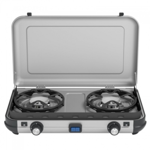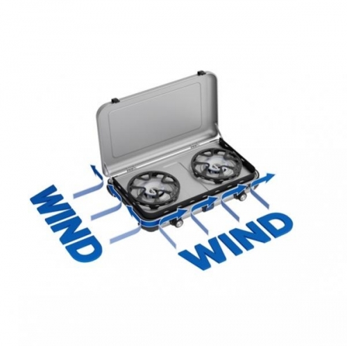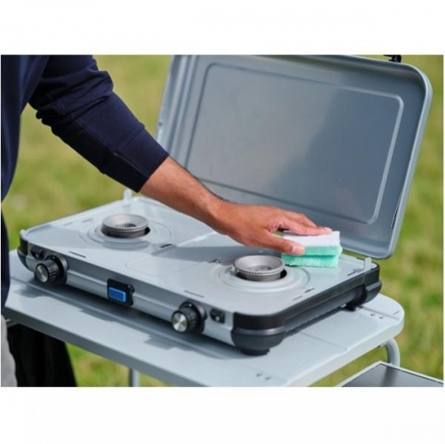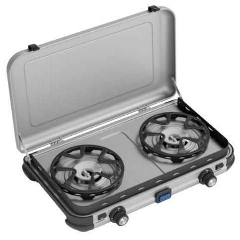 Vařič Camping Kitchen 2 Maxi je vybaven dvěma nezávislými hořáky s individuální regulací výkonu. Při vaření pro větší rodiny nebo skupiny nabízejí velké podpěry na pánve o průměru až 28 cm / umožňují použití vašich běžných kuchyňských hrnců a pánví. I když je počasí nepředvídatelné, technologie FLAMEGUARD hořáků je navržena pro optimální ochranu plamene, tak uspoříte plyn a uvaříte rychleji. Díky zesíleným pantům spojujícím víko se základnou se celý vařič stává vlastním kufříkem pro čisté a rychlé sbalení, před cestou i po ní. Podpěry pánví jsou odnímatelné pro snadné čištění v kempu.