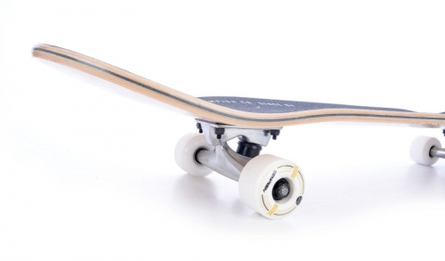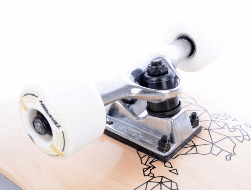 Design boardu je inspirován old-school instinkty, tudíž jen dřevo, jednoduchý černý design, raw hliníkové trucky a bílá kolečka s decentním potiskem.