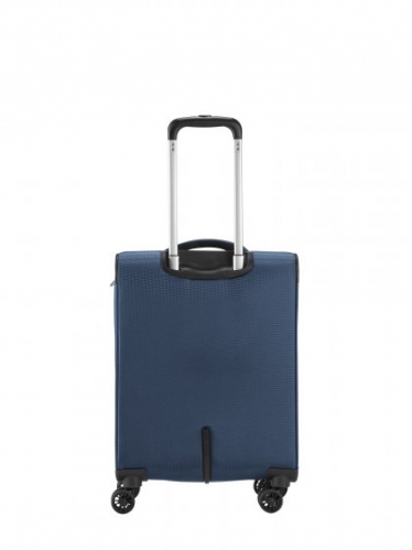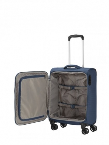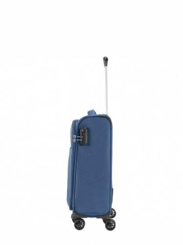 Odlehčený textilní cestovní kufr z odolného polyesteru na čtyřech kolečkách vybavený integrovaným kombinačním zámkem.