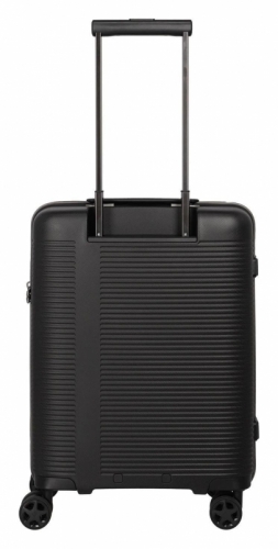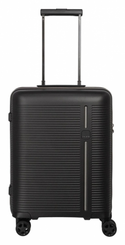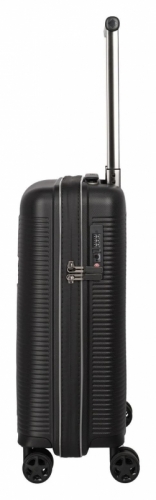 Černý skořepinový palubní kufr na čtyřech kolečkách s integrovaným TSA zámkem, vodoodpudivým zipem a luxusním interiérem vyrobený z nárazuvzdorného polypropylenu.