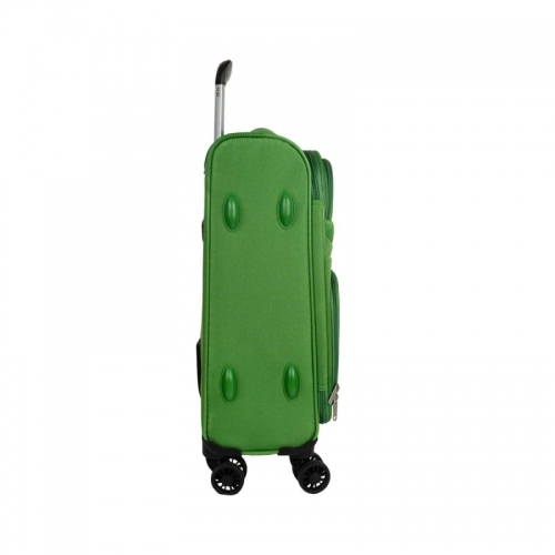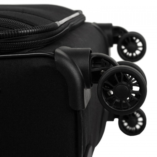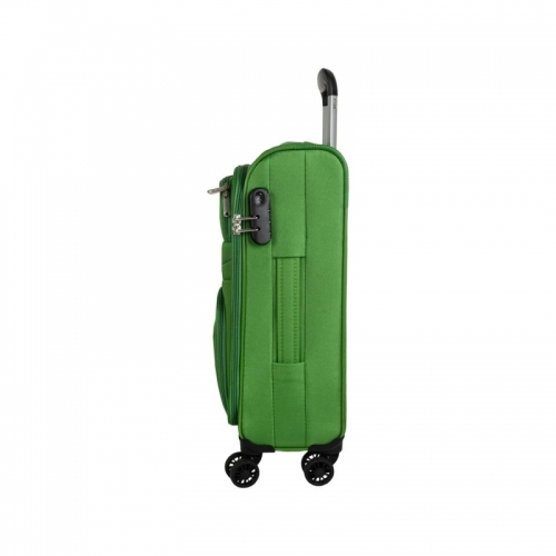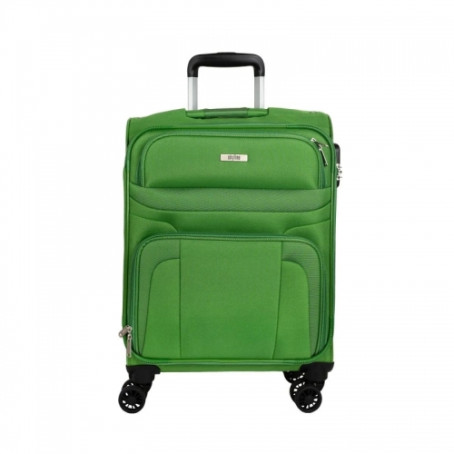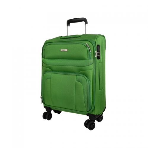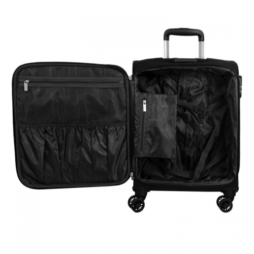 Univerzální čtyřkolečkový textilní kabinový kufr s integrovaným kombinačním zámkem, jmenovkou a dvěma předními kapsami.