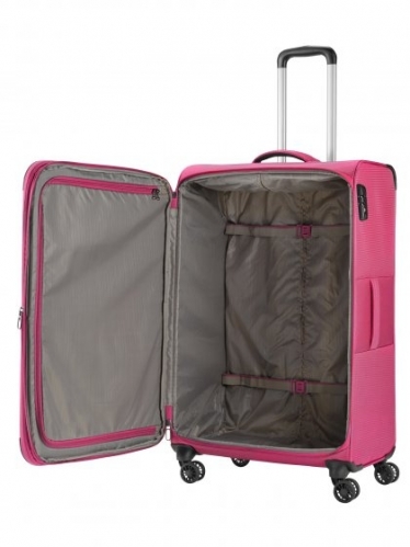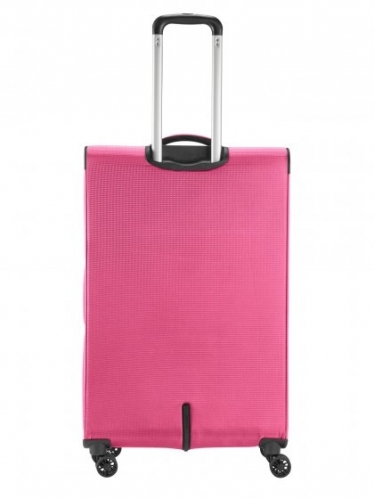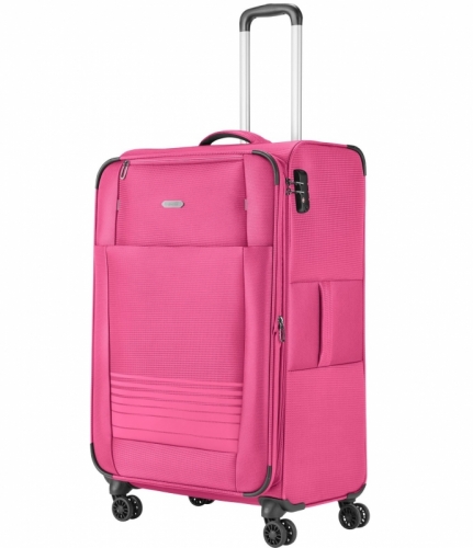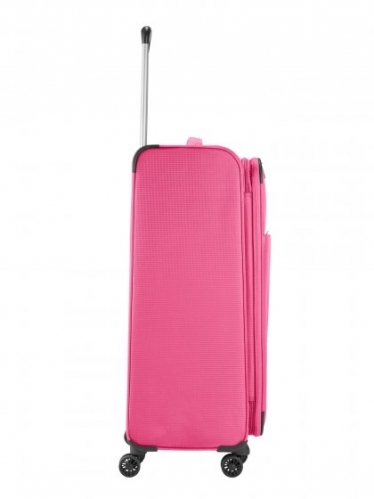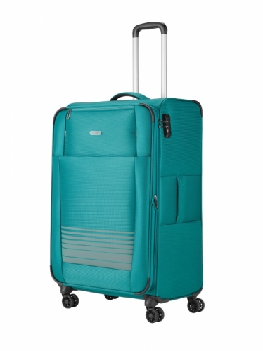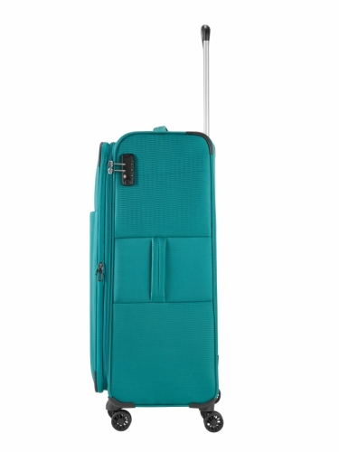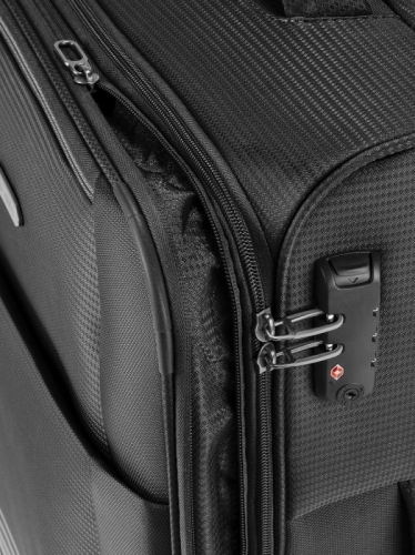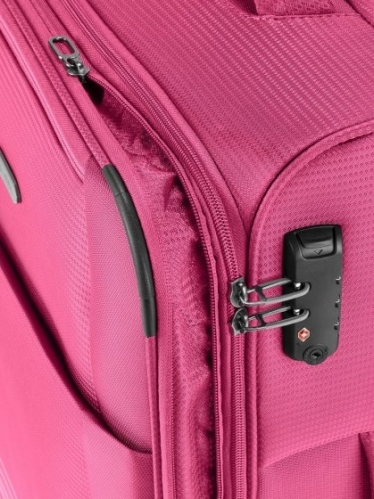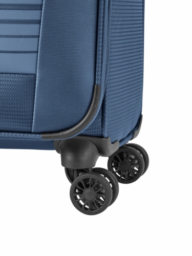 Odlehčený textilní cestovní kufr z odolného polyesteru na čtyřech kolečkách vybavený integrovaným TSA zámkem a expandérem.